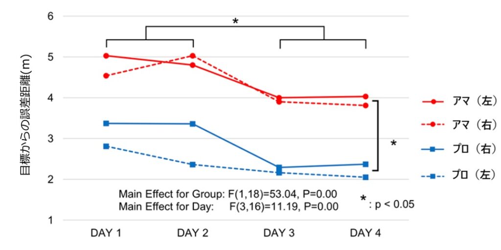 このことから、プロは非優勢側のストロークであっても短期間の練習によって距離や方向感覚を習得できる「適応力」が高いこと、そして左右の打ち方で距離や方向感覚の共通基盤をもっている可能性がうかがえます。