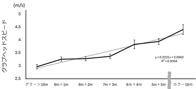 同一パターにて各条件の10m距離から直径1m以内の円形ターゲットに向かってパットを打ち、ターゲット内に止まった成功パット5回のクラブヘッドスピードを記録しました。