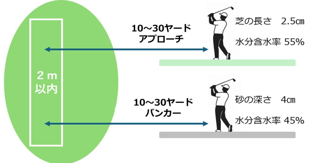 使用クラブは同一のサンドウェッジ(ロフト角56°、バウンス角10°)とし、芝生からのアプローチショットとバンカーショットの双方において、クラブフェースをスクエアに構えたノーマルなショットを行いました。