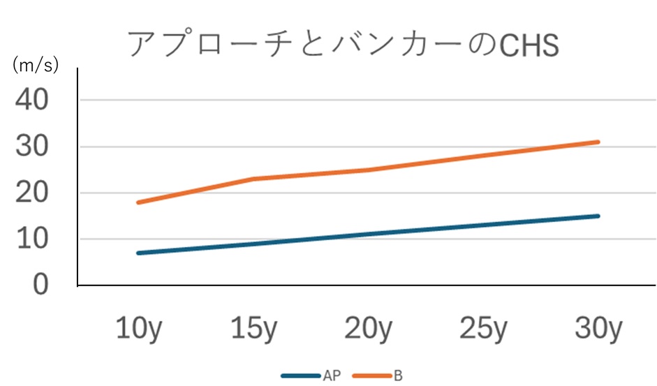 - 30ヤード以内の通常エクスプロージョンバンカーショットでは、アプローチの約2~3倍程度のCHSを必要とする。