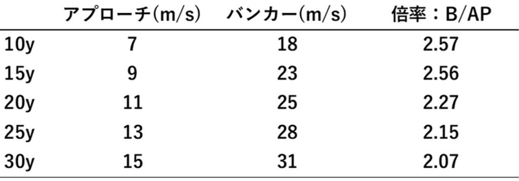 また、距離が短いほど倍率は大きく(10y=2.57)、距離が長くなるほど倍率は小さくなりました(30y=2.07)。